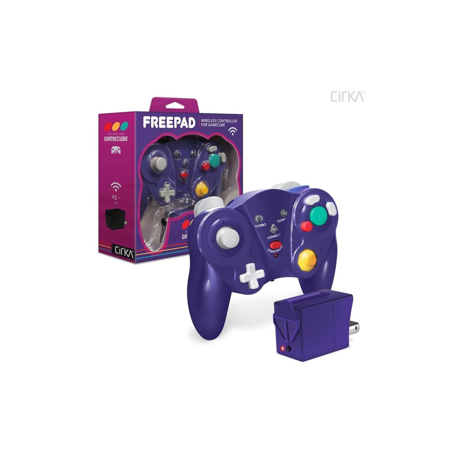 The CirKa "FreePad" Wireless Controller for GameCube® allows for easy movement up to 25 ft. from your console. Perfect for both highly-competitive and casual gaming, the FreePad features a classic button scheme, a turbo function, and force feedback. The FreePad is also compatible with Nintendo Switch®, Wii U®, PC, and Mac™ (setup and functionality may vary) via a four-port adapter for GameCube® controllers. It is also compatible with the Wii® if GameCube® ports are present on the console.